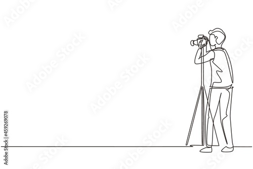 Continuous one line drawing male photographer with camera. Studio photo. Professional photographer taking pictures, images. Photography concept. Single line draw design vector graphic illustration