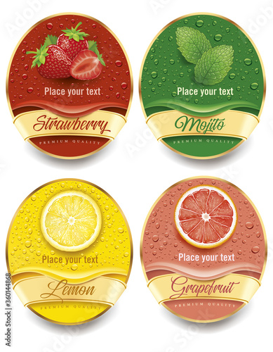 banners with fresh juice drops background, with strawberry, mint, lemon, grapefruit