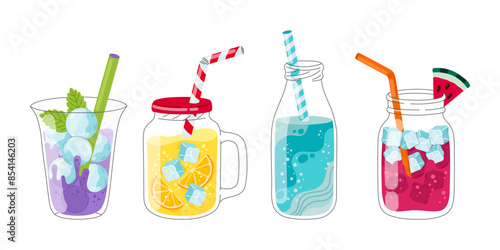 Set of fresh smoothies and sparkling drinks. Delicious soft drinks, fruit juices and mixed cocktails in different glasses. Refreshing beverages. Vector illustration for logo, marketing, banner.