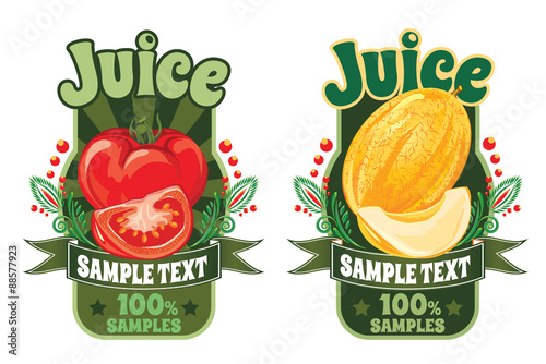 set of templates for labels of juice from the fruit of ripe sweet yellow melon and fresh red tomato