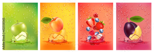 Fresh fruits juice splashing together- pear, apple, plum, apricot, strawberry, blackberry, raspberry juice drink splashing. 3d fresh fruits. Vector illustration