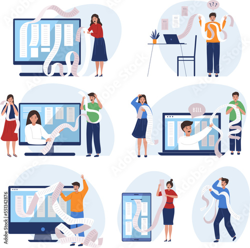 Tried exhausted businessman carrying heavy messy line on his back, stress burden, anxiety from work difficulty or overload, problem in economic crisis or pressure from too much responsibility (Vector)