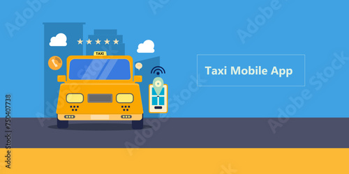 Taxi service mobile app for online booking. Smartphone screen with city map, route, and location pin for navigation. Yellow cab ordering vector illustration for transportation.