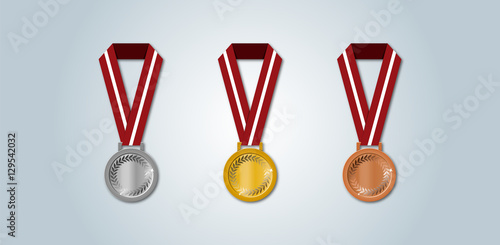 Gold, silver, bronze champion medal with red ribbon. First, second, third placement achievement bages. Realistic vector illustration medals of metal like symbol motivation or quality