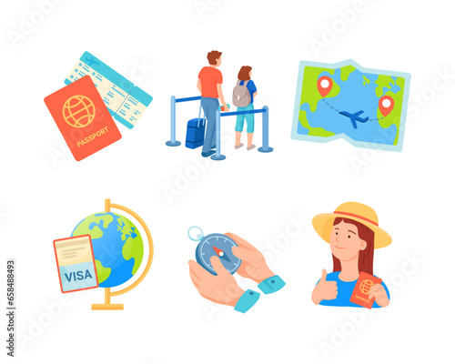 Abroad travel vector illustration set. Visa and air tickets, woman with passport, flight route on map, customs control and choosing direction. Trip, journey, travel concept