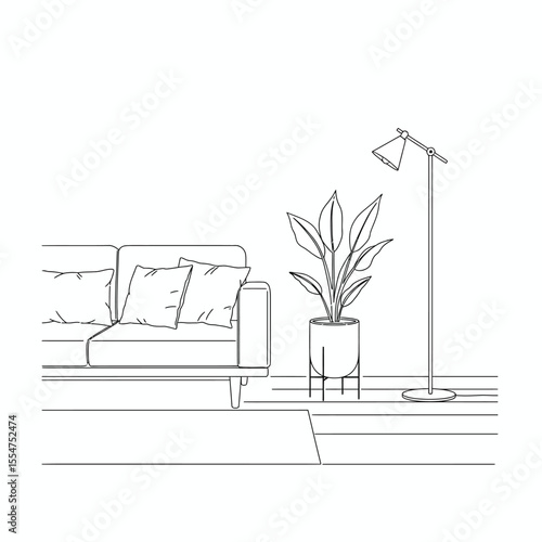 Interior Illustration of Modern Living Room with Sectional Sofa, Lighting, and Plant Minimalist Aesthetic