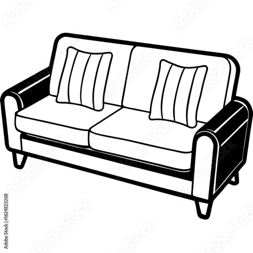 Simple black and white line drawing of a modern two seater sofa with cushions