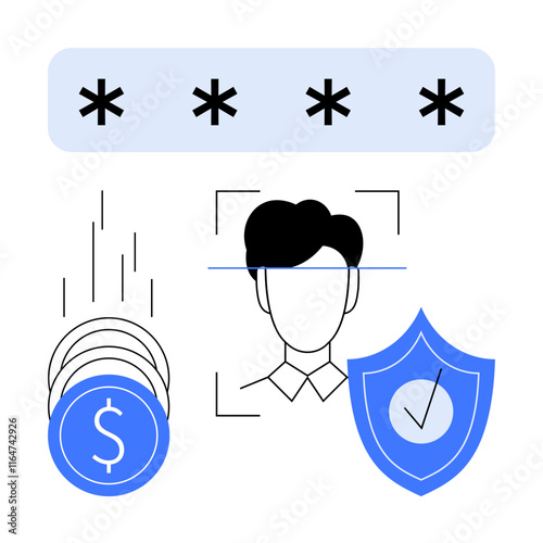 User profile icon, password entry field, and security key represent login, access control, data protection, authorization, and identity verification. Ideal for technology, privacy and cybersecurity