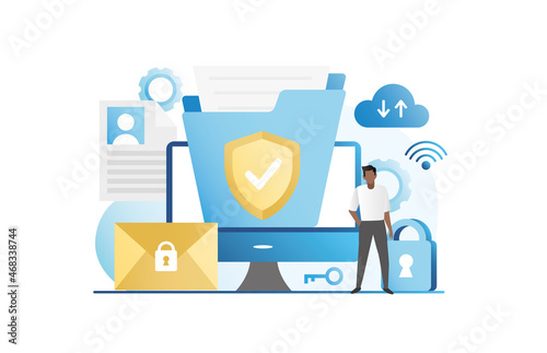 Recognize scan text file document on computer laptop vector icon or scanning business doc on pc screen flat cartoon graphic illustration, cyber authenticity or identity check image