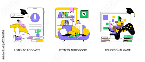 Elearning courses abstract concept vector illustration set. E-library, online education platform, learning, ebook reader, webcam conference at laptop screen, study skills abstract metaphor.