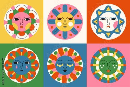 Set of stylized suns with faces. Drawn character with emotion. Colorful illustration with ethnic elements. Stickers for decor, logo, printing, textiles, packaging. Vector flat drawing