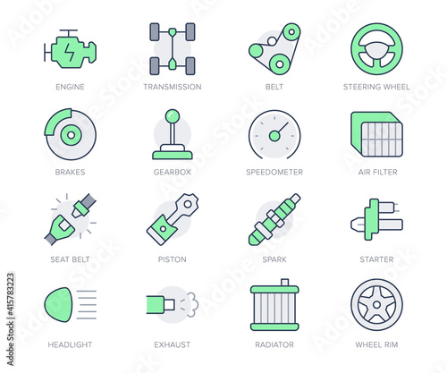 Automotive repair and service line icon set. Vector pictograms of car, engine, wrench, spark plug, and gears, thin linear illustration.