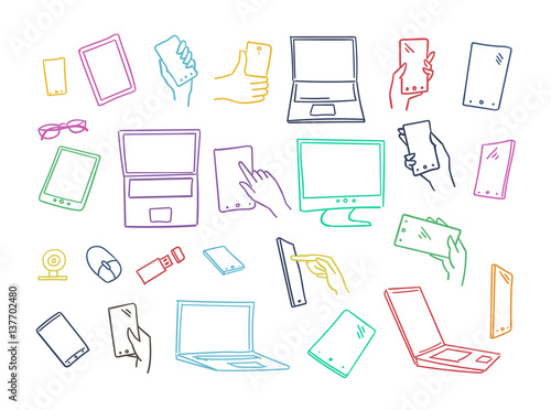 Set sketch gadgets, smartphone in hands. Monitors Electronics tablets. Illustration line, hand drawn