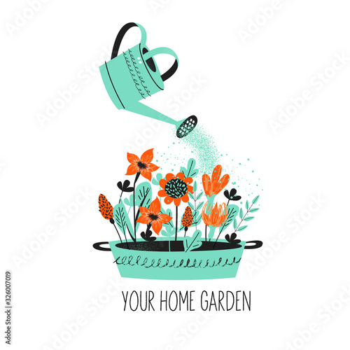 Happy little fairy waving her magic wand and watering colorful flowers with a watering-can on a pretty flowerbed in a summer garden, vector cartoon illustration isolated on a white background
