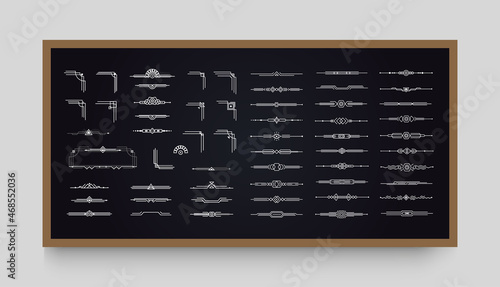 Set of Art Deco Style Geometric Design Elements Including Round and Rectangular Frames, Corners, Dividers, and Pattern Brushes with Corner Accents in Black on White