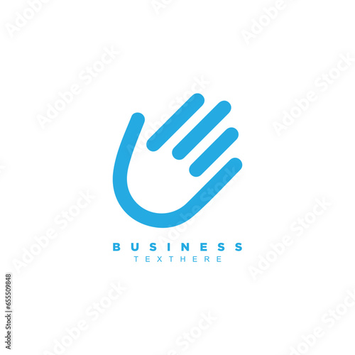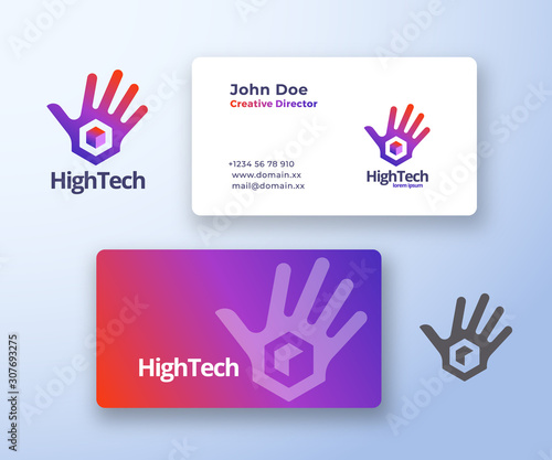 High Five Technology Abstract Vector Logo Template. Palm Hand with Cube Gradient Icon. Greeting Hi symbol concept Identity Guide with Modern Typography, mockup and app icons background layout