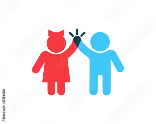 Happy children give each other high five, flat vector illustration isolated on white background.