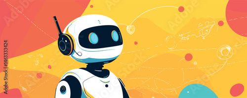 Illustration of a humanoid robot with visible brain and interface elements in the background design