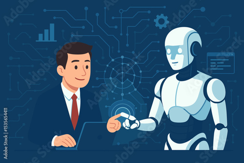 A Human Interacting With a Futuristic Robot in a Modern Digital Environment