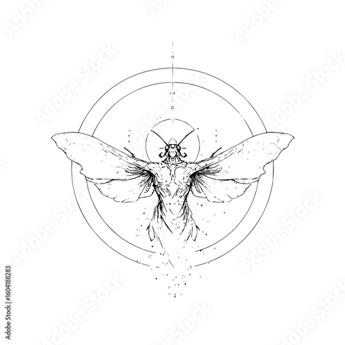 Detailed sketch of a humanoid moth figure with outstretched wings inside concentric circles design art