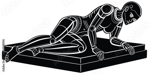 A black silhouette of a humanoid robot stands on a white background.