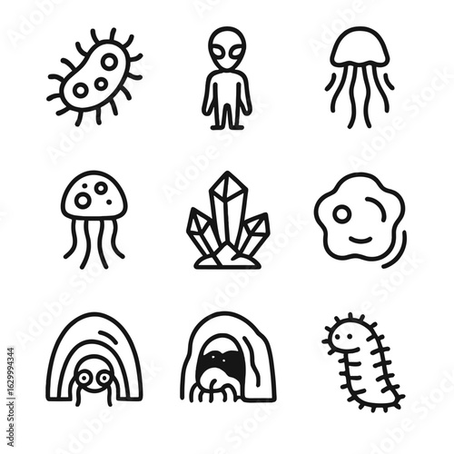 Diverse Space Creatures. Solid style icons of space creatures: tentacle monster, alien beast, insectoid alien, reptilian creature,