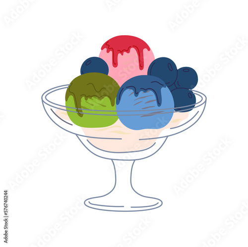 Ice cream balls with grapes in bowl isolated summer refreshing dessert. Vector glass container with icecream, sweet food snack. Homemade creamy Italian gelato