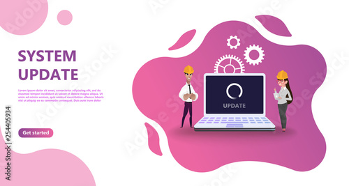 System Update. Tiny programmers upgrading operating system. IT specialists updating software, programs and applications. Technical error and service. Computer screen with updating progress bar.