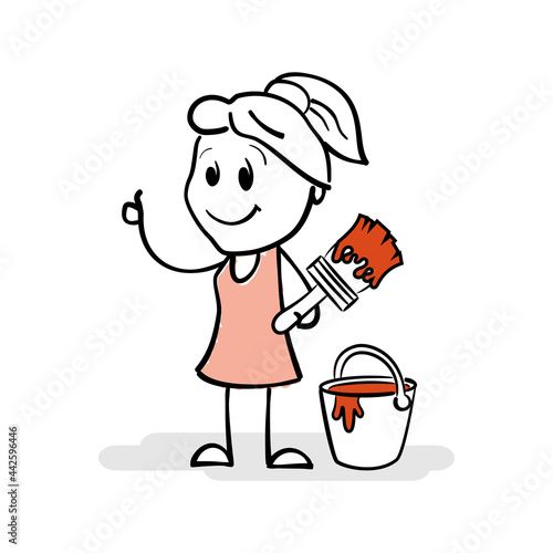 Young Woman Painting on Canvas with Brush in Fun Cartoon Illustration Style
