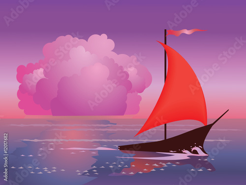Vibrant purple sailboat cruises ocean sunset scenic coastal voyage vector