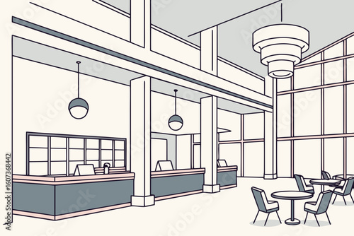 Modern architecture interior design minimalist home with ocean view large windows spacious room grey scale illustration contemporary style architectural sketch house blueprint home design building pl.