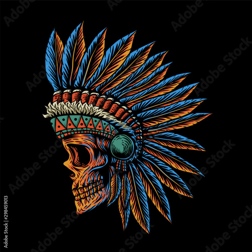 Black and white Native Indian Skull in Traditional Headdress Image Vector
