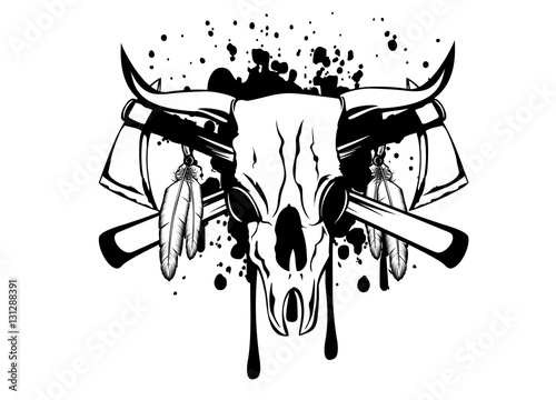 Skull wearing a Native American chief headdress and holding crossed tomahawks, tribal, warrior, feathers, axes, indigenous