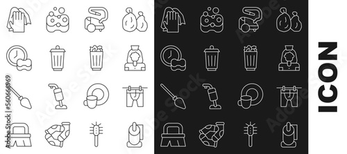 Set line Trash can, Toilet paper roll, Cleaning lady service and Garbage bag icon. Vector