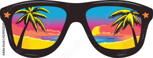 Tranquil vector illustration of a person relaxing in a beach chair under an umbrella watching the sunset over the ocean on a tropical paradise.