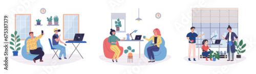 People spending time at home flat vector set - sitting on couch, cooking, pizza eating. bath, reading,  watering plants. Cozy Relaxing at home, leisure time