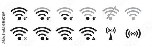 Wi-Fi icon. Wireless and Wi-Fi signal icon. Wifi and wireless signal icon symbol. Set of sign for connect of network. Wi-Fi signal strength. Level signal sign. Vector illustration.