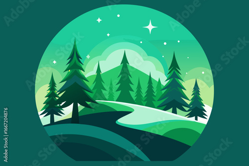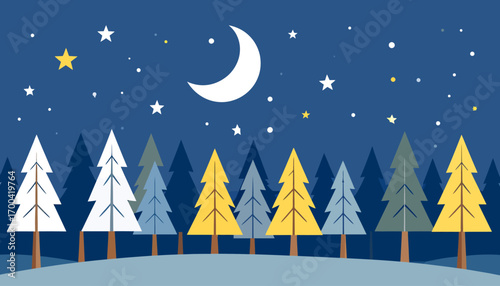 Minimalist night forest with crescent moon and stars, winter scenery.