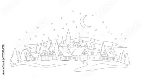 Cozy winter village nestled in a snowy forest at night. Landscape with houses, pine trees, falling snow, and a crescent moon. Editable vector illustration.