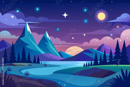 Mountain night camping landscape illustration with a tent under a starry winter sky and moon