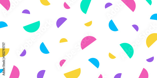 Geometric memphis retro seamless pattern 80s - 90s style. Trendy texture with color funky shapes on violet background. Vector illustration in memphis pop art style for fabric print or poster template