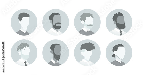 Vector set of diverse male business avatar placeholders in circular frames, without facial features. Includes various hairstyles, beards, and ethnic types for profile or app use.