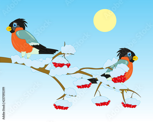 Winter greeting card with cute bullfinches