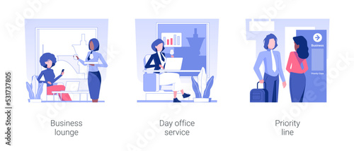 Business services in the airport isolated concept vector illustration set. Business lounge, day office service, priority line, airport departure hall, business class travel vector cartoon.