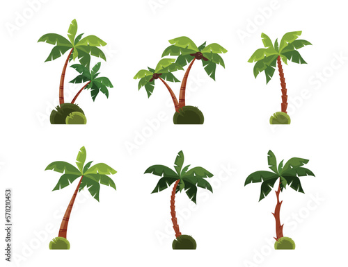 Palm tree collection. Cartoon tropical coconut and banana plant, island exotic trees, sea coast floral bush. Vector isolated set