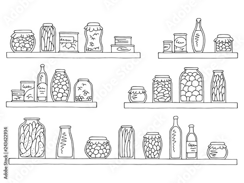 Shelves stocked with jars cans bottles and containers in a black and white minimalist illustration style | editable eps vectors