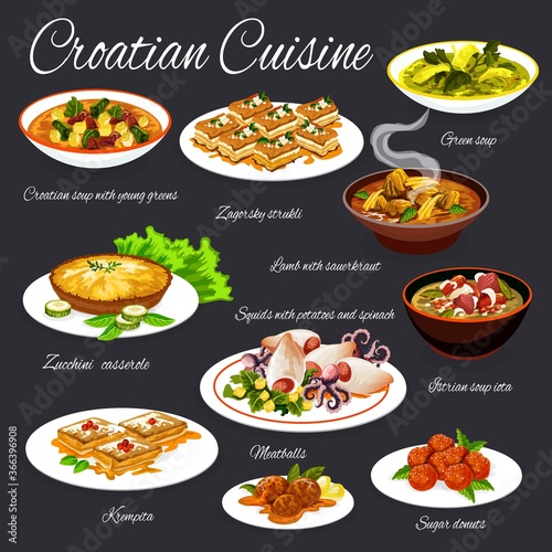 Croatian cuisine vector food, seafood, vegetable, meat dishes with desserts. Grilled squids, vegetable soups and cheese pie, zucchini casserole, meatballs and lamb stew, custard cake and sugar donut