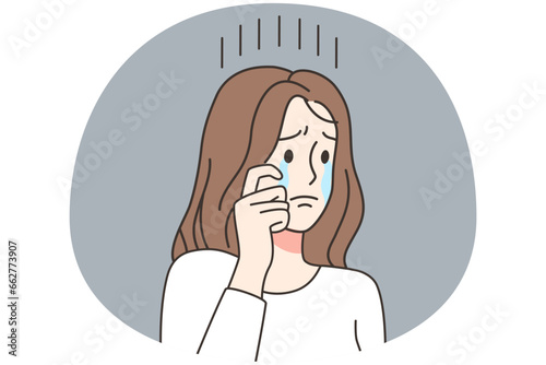 Sad child crying near playground equipment with tears in eyes