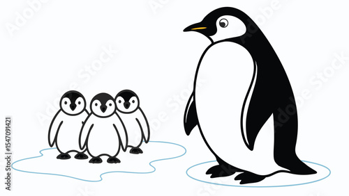 Adorable cartoon illustration of an adult penguin and three baby penguins on an ice floe in a clean environment