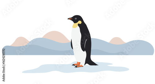 Emperor penguin stands on ice floe with mountains in background, for education use